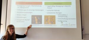 sowie den Themen ‚Wirbelsäulengerechtes Arbeiten im Alltag‘, das Seminar ‚‘Einladung zur Genussprobe: Essen mit allen Sinnen genießen!‘, die Fachstelle Sucht (BWLV –‚Sucht/Abhängigkeit/Tipps und Hilfen‘), das Seminar ‚Selbstfürsorge und Stressabbau durch Achtsamkeit und das Gesundheitsamt mit dem Thema ‚Geschlechtskrankheiten – erkennen, behandeln, sich schützen‘.
