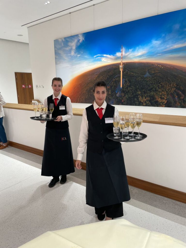 Am Abend hatten wir dann den besonderen Arbeitsauftrag in der Landesvertretung. Dort fand ein Weinsommerfest statt, bei dem über 500 geladene Gäste erwartet wurden. Als angehende Hotelfachleute, Hotelkaufleute und Köche waren wir für die Bewirtung der Gäste zuständig. Wir servierten Getränke und sorgten dafür, dass die Buffets immer gut gefüllt waren. Es war eine großartige Erfahrung, in einem solchen Rahmen zu arbeiten und unsere Fähigkeiten unter Beweis zu stellen.